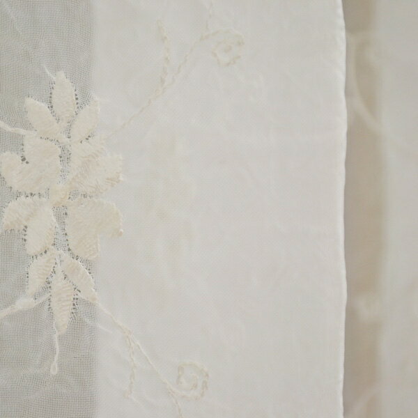 しわ加工ボイルと、細かく刺繍された模様が表情豊かに窓辺を飾ります。