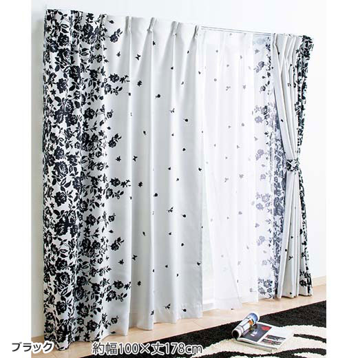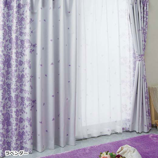 Item Detail サイズ(約cm) 幅100×丈178 品質 ポリエステル100% 仕様 3級遮光(遮光率99.4%以上、99.8%未満) 付属品 アジャスターフック共布タッセル(厚地のみ) 取扱い 洗濯機OK(ネット使用) 生産国 中国製 ローズとバタフライの上品な共演。