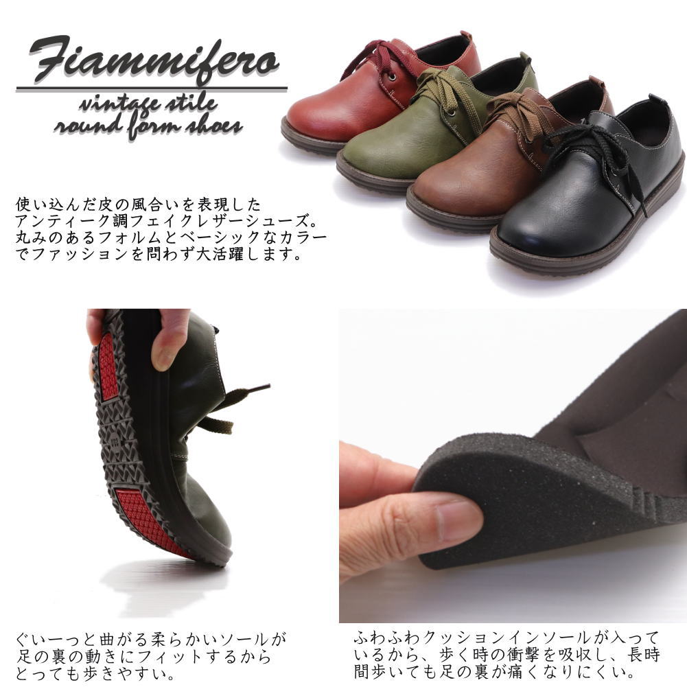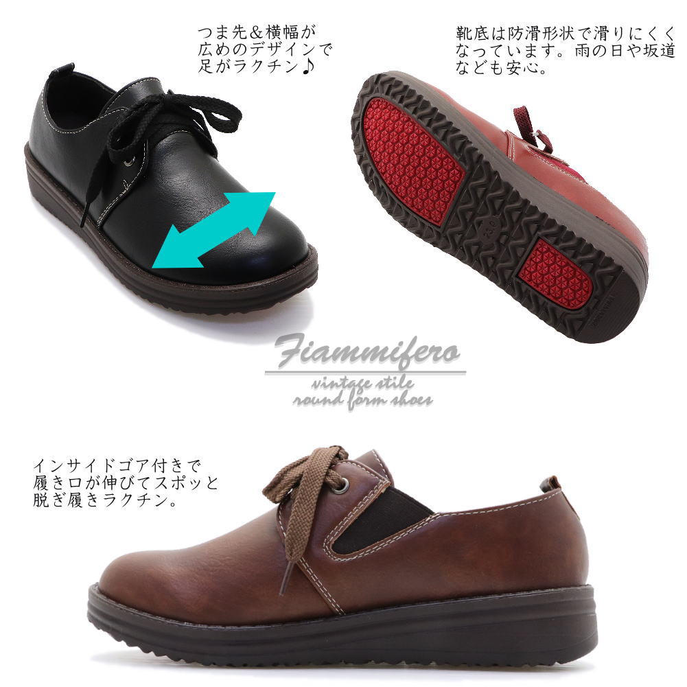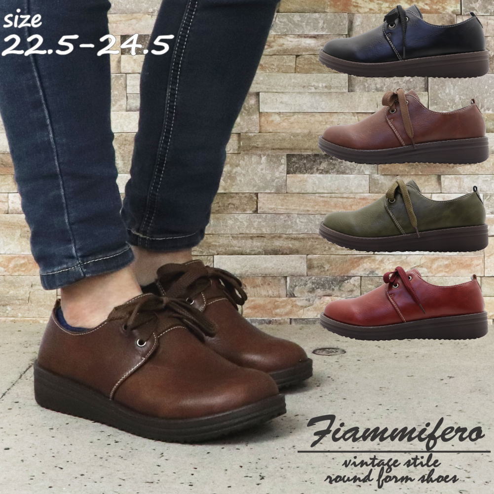 即納 丸いフォルムのレディースシューズ 軽量 クッションインソール カジュアル レースアップ おでこ Fiammifero アンティーク風 No9019