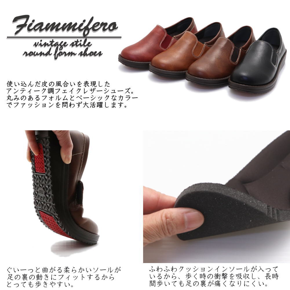 即納 丸いフォルムのレディースシューズ 軽量 クッションインソール カジュアルスリッポン おでこ Fiammifero アンティーク風 No9002